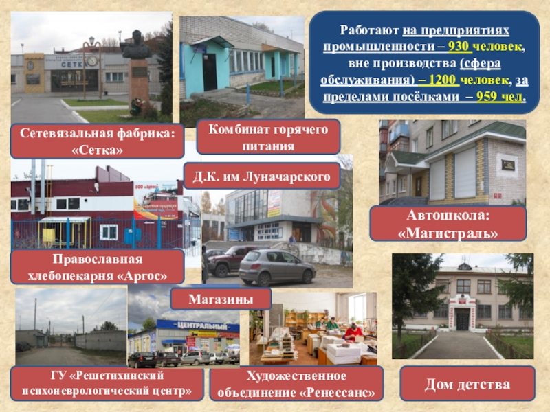 Работают на предприятиях промышленности – 930 человек, вне производства (сфера обслуживания) – 1200 человек, за пределами посёлками – 959 чел.