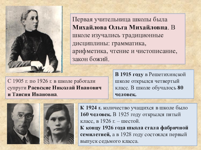С 1905 г. по 1926 г. в школе работали супруги Раевские Николай Иванович