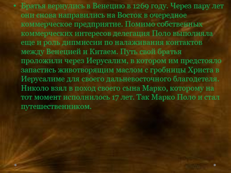 Слайд 6Братья вернулись в Венецию в 1269 году. Через пару лет они