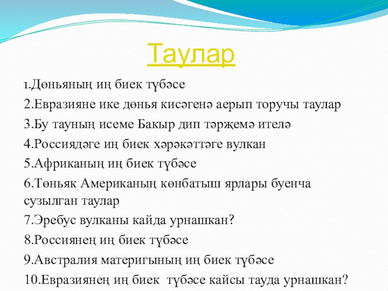 10.Евразиянең иң биек түбәсе кайсы тауда урнашкан?