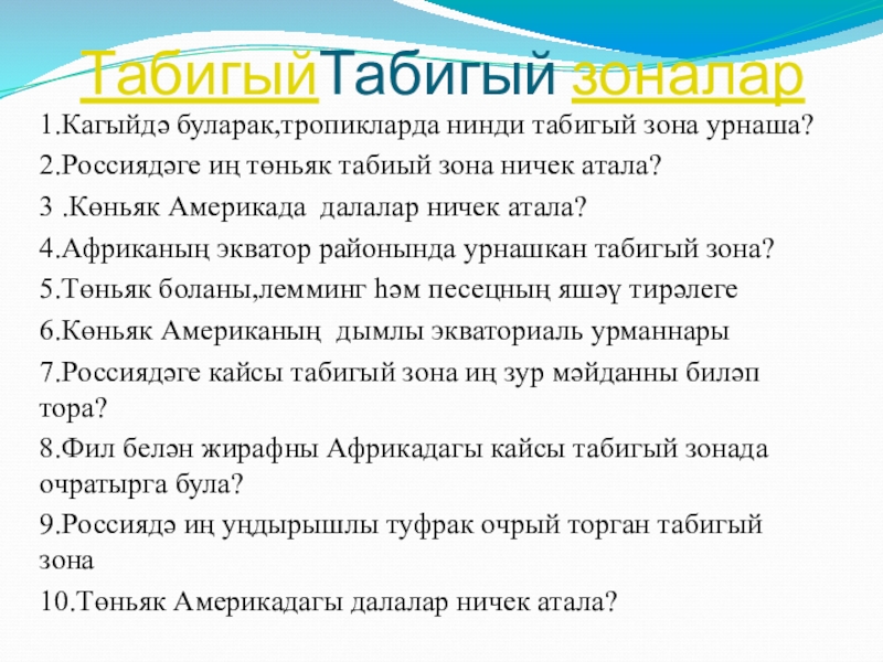 1.Кагыйдә буларак,тропикларда нинди табигый зона урнаша?