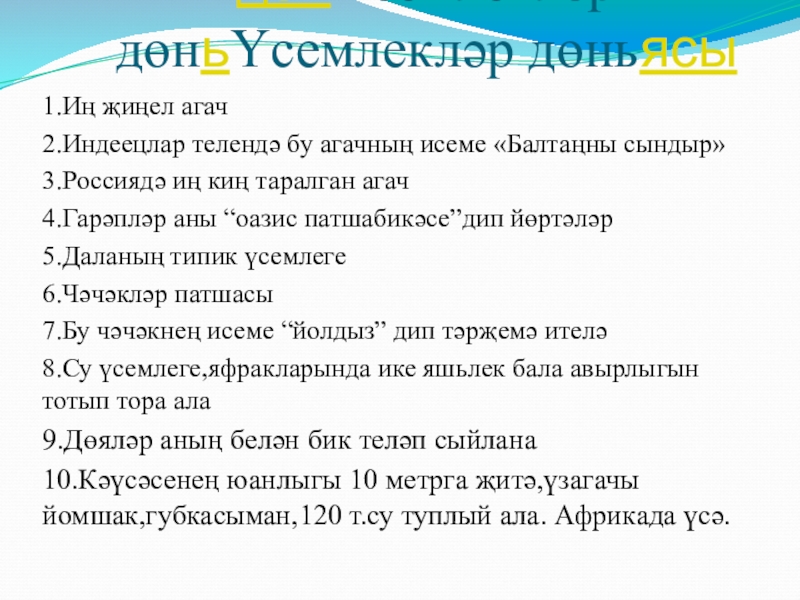 10.Кәүсәсенең юанлыгы 10 метрга җитә,үзагачы йомшак,губкасыман,120 т.су туплый ала. Африкада үсә.