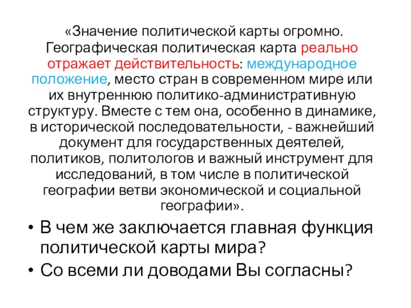 Слайд 34 «Значение политической карты огромно. Географическая политическая карта реально отражает действительность: