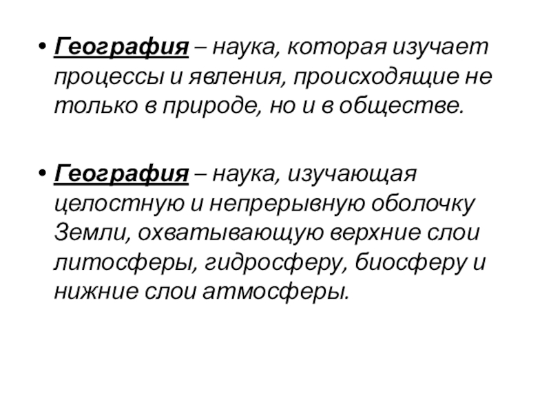 География – наука, изучающая целостную и непрерывную оболочку Земли, охватывающую верхние слои литосферы, гидросферу, биосферу и нижние слои атмосферы.