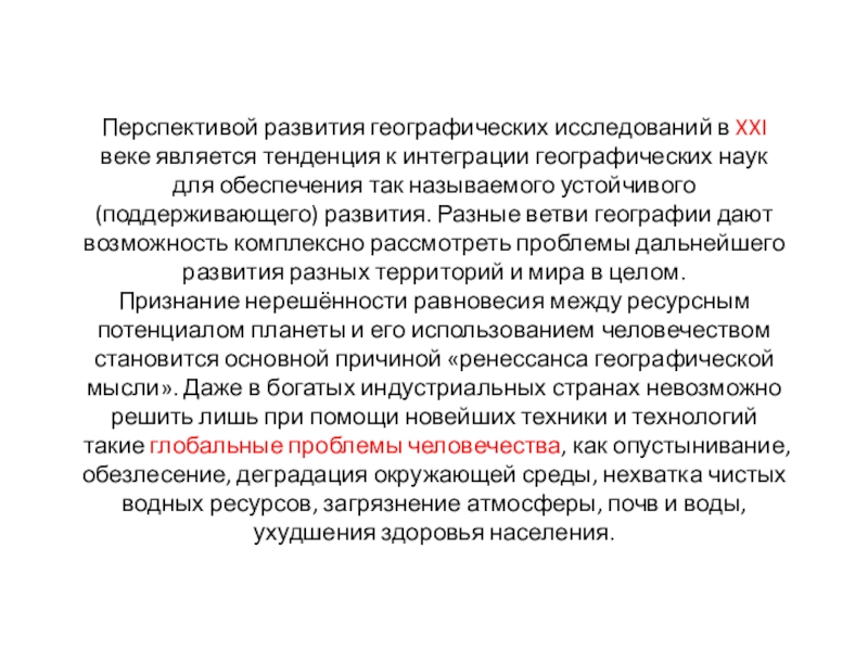 Признание нерешённости равновесия между ресурсным потенциалом планеты и его использованием человечеством становится основной причиной «ренессанса географической мысли». Даже в богатых индустриальных странах невозможно решить лишь при помощи новейших техники и технологий такие глобальные проблемы человечества, как опустынивание, обезлесение, деградация окружающей среды, нехватка чистых водных ресурсов, загрязнение атмосферы, почв и воды, ухудшения здоровья населения.