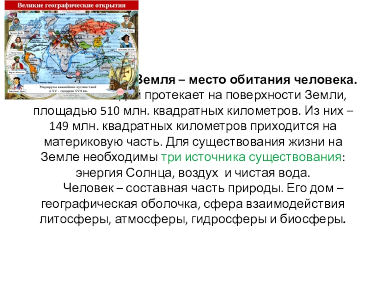 Жизнь людей протекает на поверхности Земли, площадью 510 млн. квадратных километров. Из них – 149 млн. квадратных километров приходится на материковую часть. Для существования жизни на Земле необходимы три источника существования: энергия Солнца, воздух и чистая вода.