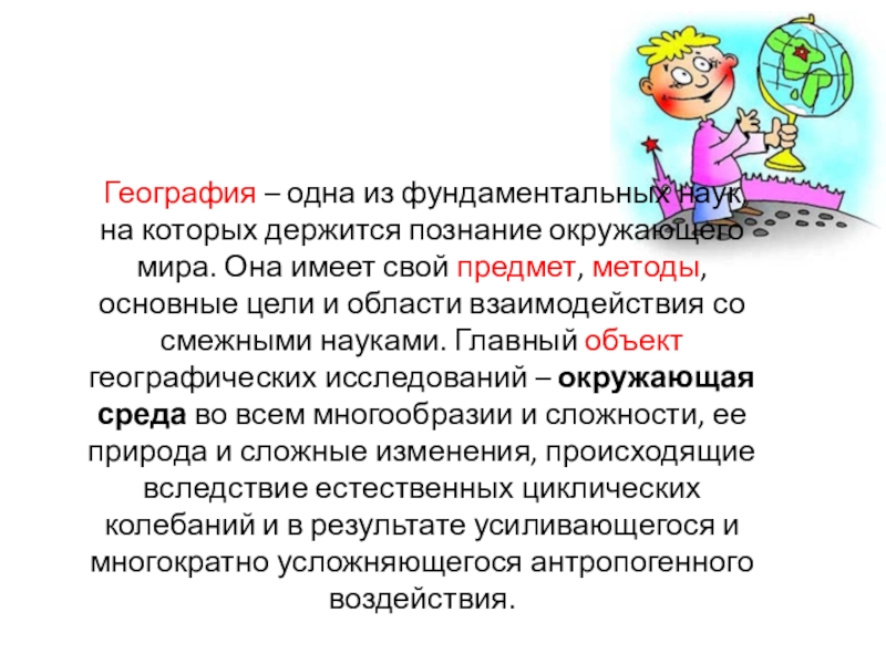 окружающего мира. Она имеет свой предмет, методы, основные цели и области взаимодействия со смежными науками. Главный объект географических исследований – окружающая среда во всем многообразии и сложности, ее природа и сложные изменения, происходящие вследствие естественных циклических колебаний и в результате усиливающегося и многократно усложняющегося антропогенного воздействия.