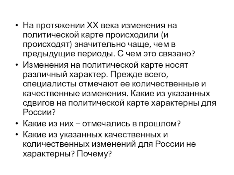 Изменения на политической карте носят различный характер. Прежде всего, специалисты отмечают ее количественные и качественные изменения. Какие из указанных сдвигов на политической карте характерны для России?