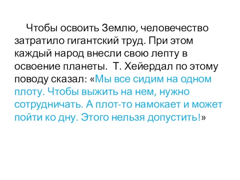 внесли свою лепту в освоение планеты. Т. Хейердал по этому поводу сказал: «Мы все сидим на одном плоту. Чтобы выжить на нем, нужно сотрудничать. А плот-то намокает и может пойти ко дну. Этого нельзя допустить!»
