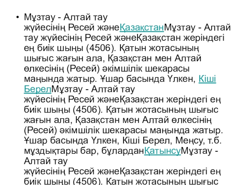 Слайд 12Мұзтау - Алтай тау жүйесінің Ресей жәнеҚазақстанМұзтау - Алтай тау жүйесінің Ресей жәнеҚазақстан жеріндегі ең биік