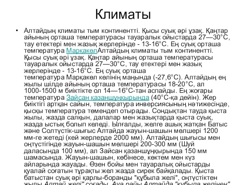 температурасы тауаралык ойыстарда 27—30°С, тау етектері мен жазық жерлерінде - 13-16°С. Ең суық орташа температура МарқакөлАлтайдың климаты тым континентті. Қысы суық әрі ұзақ. Қаңтар айының орташа температурасы тауаралык ойыстарда 27—30°С, тау етектері мен жазық жерлерінде - 13-16°С. Ең суық орташа температура Марқакөл көлінің маңында (-27,6°С). Алтайдың ең жылы шілде айының орташа температурасы 18-20°С, ал 1000-1500 м биіктікте ол 14—16°С-тан аспайды. Ең жоғары температура Зайсан қазаншұңқырында (40°С-қа дейін). Жер биіктігі артқан сайын, температура инверсиясының нәтижесінде, қысқы температура төмендеп отырады. Сондықтан тауда қыста жылы, жазда салқын, далалар мен жазықтарда қыста суық, жазда ыстық болып келеді. Ылғалды, желге ашық жатқан Батыс және Солтүстік-шығыс Алтайда жауын-шашын мөлшері 1200 мм-ге жетеді (кей жерлерде 2000 мм). Алтайдың шығысы мен оңтүстігінде жауын-шашын мөлшері 200-300 мм (Шуй даласында 100 мм), ал Зайсан қазаншұңқырында 150 мм шамасында. Жауын-шашын, көбінесе, көктем мен күз айларында жауады. Өзен бойы мен тауаралық ойыстарды қуалай соғатын тұрақты жел жазда сирек байқалады. Қыста батыстан суық әрі қарлы-боранды "құбыла желі", оңтүстіктен жылы Алтай желі" соғады. Ауа райы Алтайда "құбыла желінен" кейін ашық, аязды болып келсе, "Алтай желінен" кейін онда бүлтты әрі жылы болып, қар жауады.