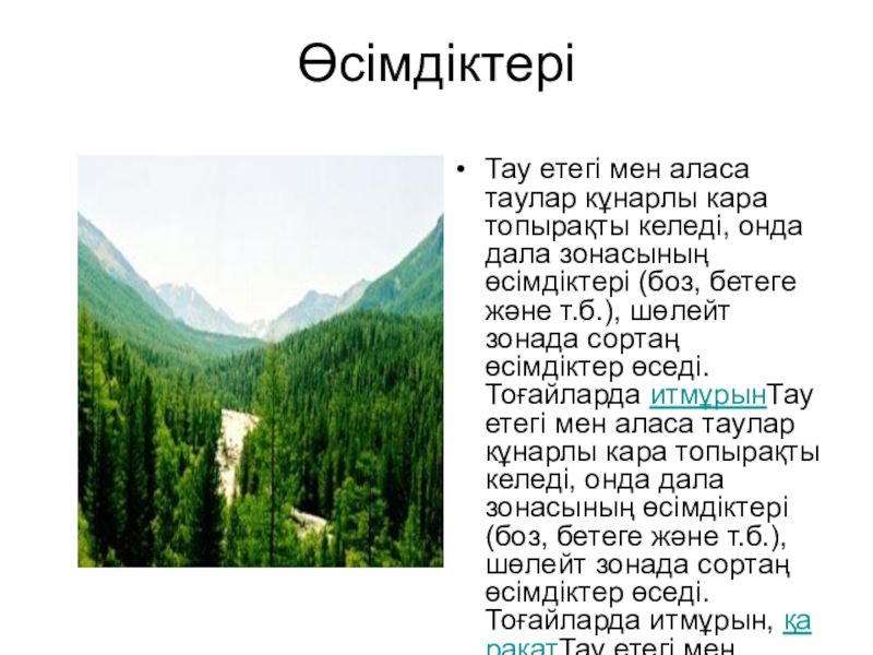 зонасының өсімдіктері (боз, бетеге және т.б.), шөлейт зонада сортаң өсімдіктер өседі. Тоғайларда итмұрынТау етегі мен аласа таулар кұнарлы кара топырақты келеді, онда дала зонасының өсімдіктері (боз, бетеге және т.б.), шөлейт зонада сортаң өсімдіктер өседі. Тоғайларда итмұрын, қарақатТау етегі мен аласа таулар кұнарлы кара топырақты келеді, онда дала зонасының өсімдіктері (боз, бетеге және т.б.), шөлейт зонада сортаң өсімдіктер өседі. Тоғайларда итмұрын, қарақат, жидек, тау аралық аудандарда күлгінді тарғақ шөп, қоңырбас, т.б. шөп тектес өсімдіктер шығады.
