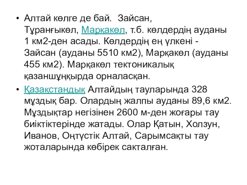 Слайд 10Алтай көлге де бай. Зайсан, Тұранғыкөл, Марқакөл, т.б. көлдердің ауданы 1 км2-ден