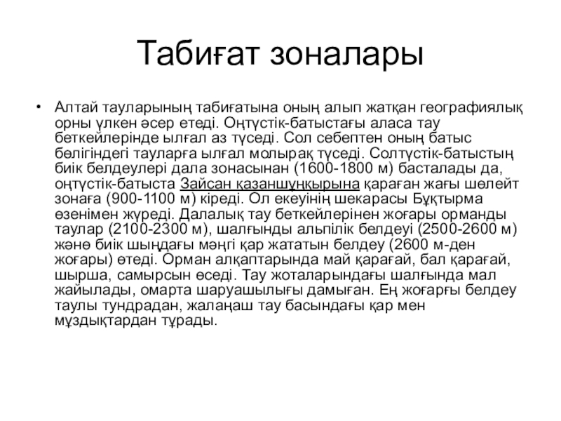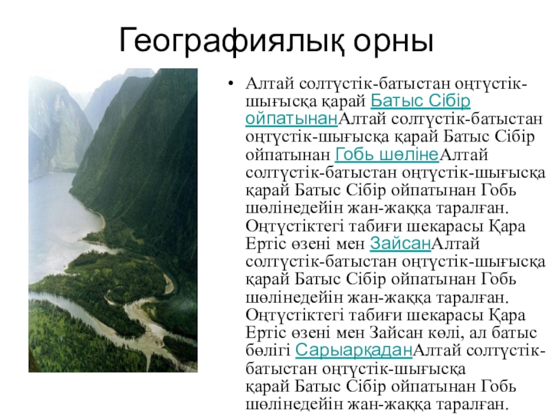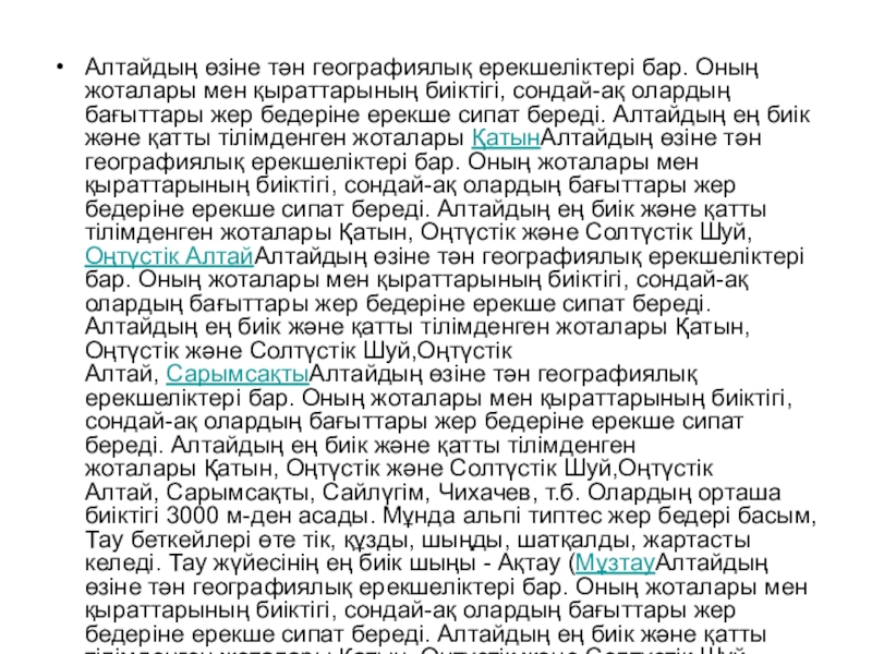 Слайд 5Алтайдың өзіне тән географиялық ерекшеліктері бар. Оның жоталары мен қыраттарының биіктігі,