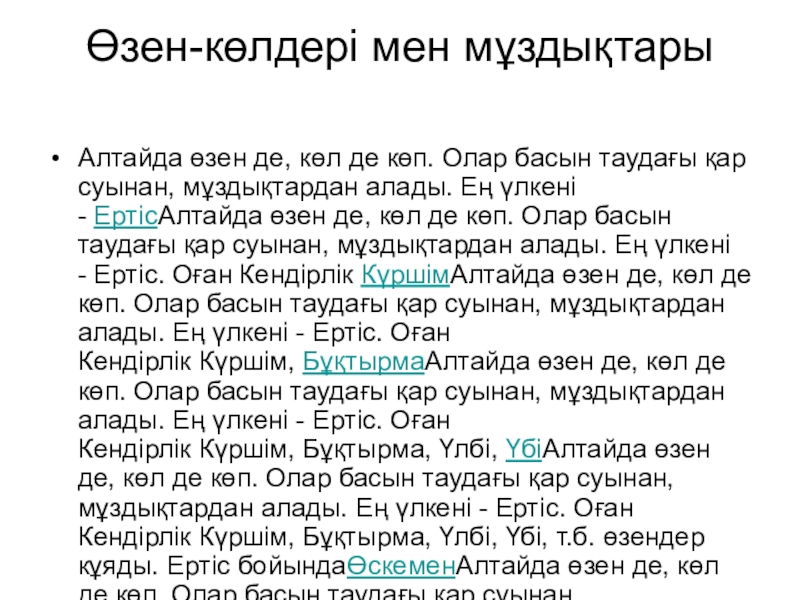 қар суынан, мұздықтардан алады. Ең үлкені - ЕртісАлтайда өзен де, көл де көп. Олар басын таудағы қар суынан, мұздықтардан алады. Ең үлкені - Ертіс. Оған Кендірлік КүршімАлтайда өзен де, көл де көп. Олар басын таудағы қар суынан, мұздықтардан алады. Ең үлкені - Ертіс. Оған Кендірлік Күршім, БұқтырмаАлтайда өзен де, көл де көп. Олар басын таудағы қар суынан, мұздықтардан алады. Ең үлкені - Ертіс. Оған Кендірлік Күршім, Бұқтырма, Үлбі, ҮбіАлтайда өзен де, көл де көп. Олар басын таудағы қар суынан, мұздықтардан алады. Ең үлкені - Ертіс. Оған Кендірлік Күршім, Бұқтырма, Үлбі, Үбі, т.б. өзендер кұяды. Ертіс бойындаӨскеменАлтайда өзен де, көл де көп. Олар басын таудағы қар суынан, мұздықтардан алады. Ең үлкені - Ертіс. Оған Кендірлік Күршім, Бұқтырма, Үлбі, Үбі, т.б. өзендер кұяды. Ертіс бойындаӨскемен, БұқтырмаАлтайда өзен де, көл де көп. Олар басын таудағы қар суынан, мұздықтардан алады. Ең үлкені - Ертіс. Оған Кендірлік Күршім, Бұқтырма, Үлбі, Үбі, т.б. өзендер кұяды. Ертіс бойындаӨскемен, Бұқтырма, Шүлбі электр стансалары салынған. Олар бүкіл Шығыс ҚазақстанғаАлтайда өзен де, көл де көп. Олар басын таудағы қар суынан, мұздықтардан алады. Ең үлкені - Ертіс. Оған Кендірлік Күршім, Бұқтырма, Үлбі, Үбі, т.б. өзендер кұяды. Ертіс бойындаӨскемен, Бұқтырма, Шүлбі электр стансалары салынған. Олар бүкіл Шығыс Қазақстанға жәнe республиканың басқа жерлеріне электр қуатын береді. Шағын өзендер көп. Олардың ішінде Ақ БерелАлтайда өзен де, көл де көп. Олар басын таудағы қар суынан, мұздықтардан алады. Ең үлкені - Ертіс. Оған Кендірлік Күршім, Бұқтырма, Үлбі, Үбі, т.б. өзендер кұяды. Ертіс бойындаӨскемен, Бұқтырма, Шүлбі электр стансалары салынған. Олар бүкіл Шығыс Қазақстанға жәнe республиканың басқа жерлеріне электр қуатын береді. Шағын өзендер көп. Олардың ішінде Ақ Берел, Тұрғысын, Березовка, Көкпекті, Кіші ҮлбіАлтайда өзен де, көл де көп. Олар басын таудағы қар суынан, мұздықтардан алады. Ең үлкені - Ертіс. Оған Кендірлік Күршім, Бұқтырма, Үлбі, Үбі, т.б. өзендер кұяды. Ертіс бойындаӨскемен, Бұқтырма, Шүлбі электр стансалары салынған. Олар бүкіл Шығыс Қазақстанға жәнe республиканың басқа жерлеріне электр қуатын береді. Шағын өзендер көп. Олардың ішінде Ақ Берел, Тұрғысын, Березовка, Көкпекті, Кіші Үлбі,ҚалжырАлтайда өзен де, көл де көп. Олар басын таудағы қар суынан, мұздықтардан алады. Ең үлкені - Ертіс. Оған Кендірлік Күршім, Бұқтырма, Үлбі, Үбі, т.б. өзендер кұяды. Ертіс бойындаӨскемен, Бұқтырма, Шүлбі электр стансалары салынған. Олар бүкіл Шығыс Қазақстанға жәнe республиканың басқа жерлеріне электр қуатын береді. Шағын өзендер көп. Олардың ішінде Ақ Берел, Тұрғысын, Березовка, Көкпекті, Кіші Үлбі,Қалжыр, Қалғұты, Ұлан, БілезіктіАлтайда өзен де, көл де көп. Олар басын таудағы қар суынан, мұздықтардан алады. Ең үлкені - Ертіс. Оған Кендірлік Күршім, Бұқтырма, Үлбі, Үбі, т.б. өзендер кұяды. Ертіс бойындаӨскемен, Бұқтырма, Шүлбі электр стансалары салынған. Олар бүкіл Шығыс Қазақстанға жәнe республиканың басқа жерлеріне электр қуатын береді. Шағын өзендер көп. Олардың ішінде Ақ Берел, Тұрғысын, Березовка, Көкпекті, Кіші Үлбі,Қалжыр, Қалғұты, Ұлан, Білезікті, ҚызылсуАлтайда өзен де, көл де көп. Олар басын таудағы қар суынан, мұздықтардан алады. Ең үлкені - Ертіс. Оған Кендірлік Күршім, Бұқтырма, Үлбі, Үбі, т.б. өзендер кұяды. Ертіс бойындаӨскемен, Бұқтырма, Шүлбі электр стансалары салынған. 