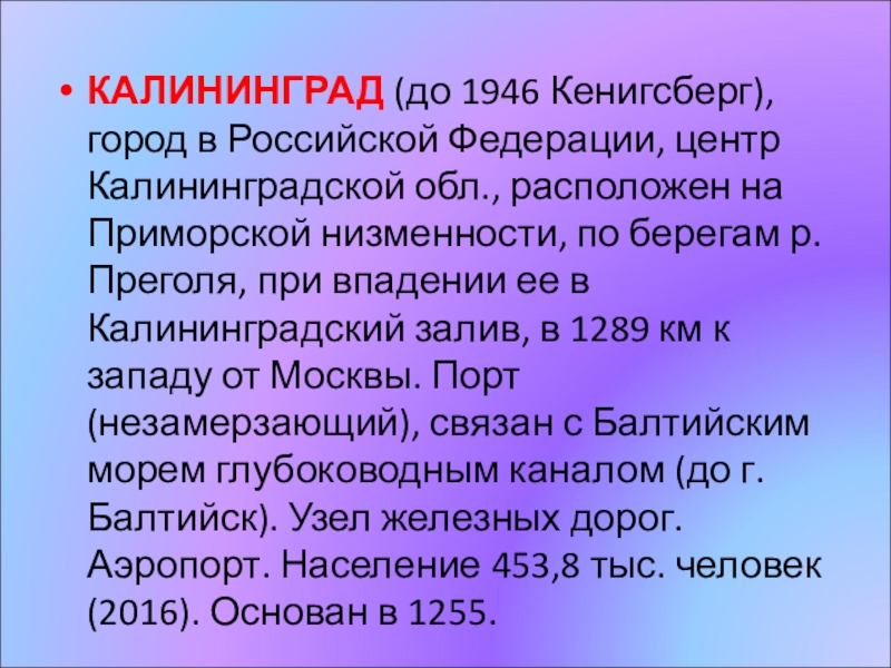Слайд 3КАЛИНИНГРАД (до 1946 Кенигсберг), город в Российской Федерации, центр Калининградской обл.,