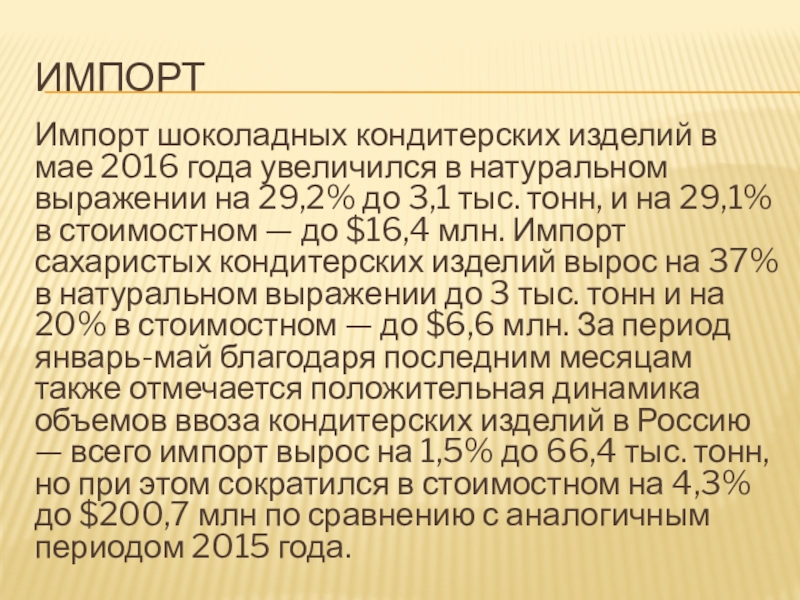 выражении на 29,2% до 3,1 тыс. тонн, и на 29,1% в стоимостном — до $16,4 млн. Импорт сахаристых кондитерских изделий вырос на 37% в натуральном выражении до 3 тыс. тонн и на 20% в стоимостном — до $6,6 млн. За период январь-май благодаря последним месяцам также отмечается положительная динамика объемов ввоза кондитерских изделий в Россию — всего импорт вырос на 1,5% до 66,4 тыс. тонн, но при этом сократился в стоимостном на 4,3% до $200,7 млн по сравнению с аналогичным периодом 2015 года.