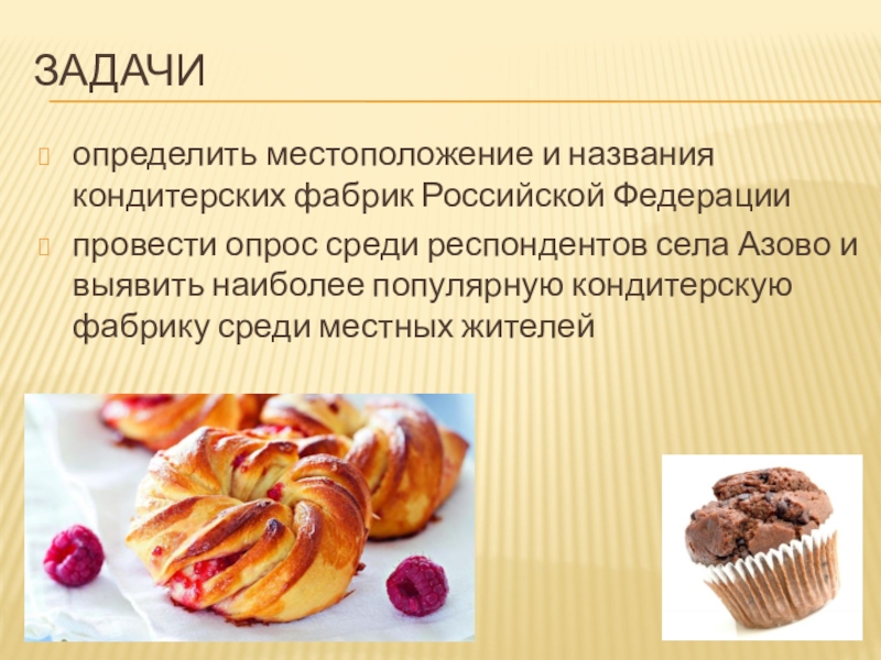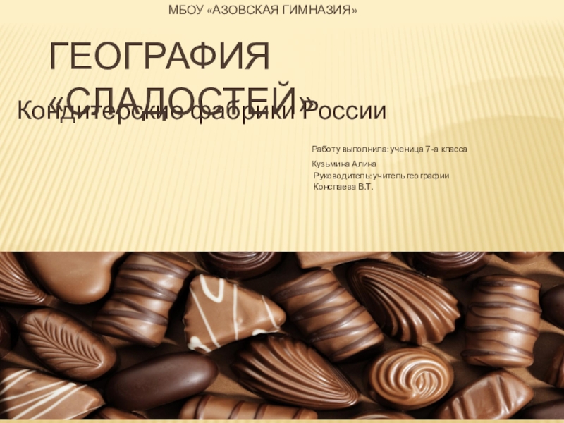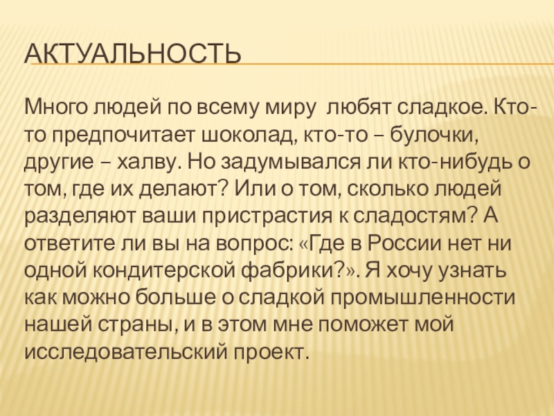 – булочки, другие – халву. Но задумывался ли кто-нибудь о том, где их делают? Или о том, сколько людей разделяют ваши пристрастия к сладостям? А ответите ли вы на вопрос: «Где в России нет ни одной кондитерской фабрики?». Я хочу узнать как можно больше о сладкой промышленности нашей страны, и в этом мне поможет мой исследовательский проект.