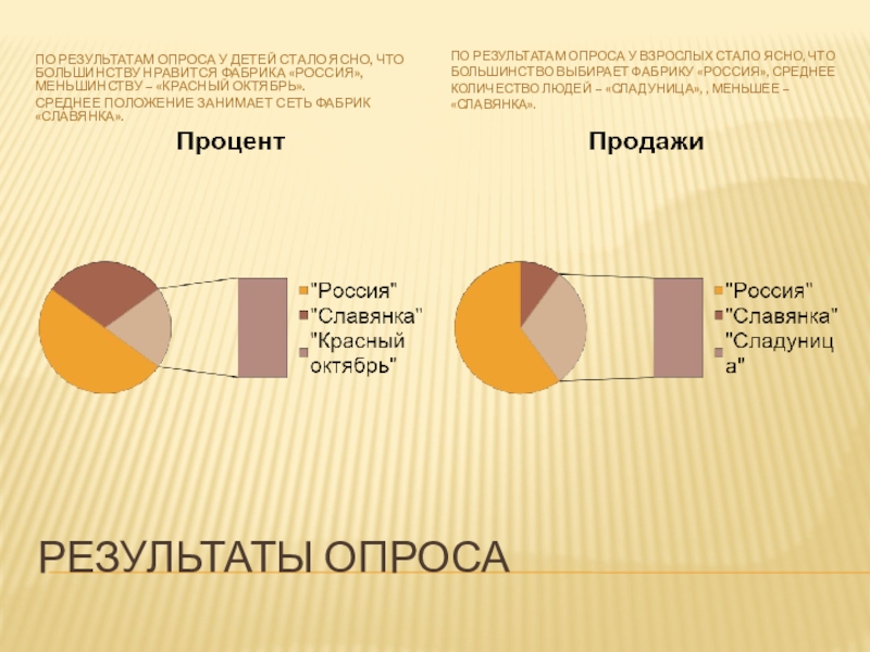 По результатам опроса у взрослых стало ясно, что большинство выбирает фабрику «Россия», среднее количество людей – «Сладуница», , меньшее – «Славянка».