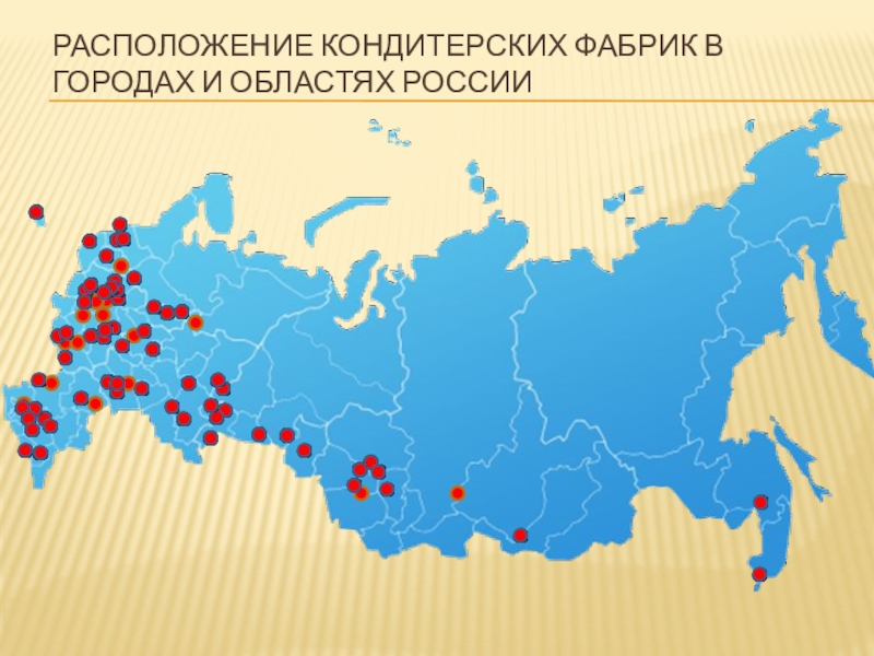 Слайд 8Расположение кондитерских фабрик в городах и областях России