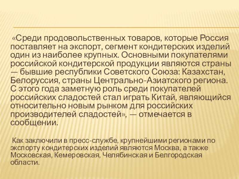 изделий один из наиболее крупных. Основными покупателями российской кондитерской продукции являются страны — бывшие республики Советского Союза: Казахстан, Белоруссия, страны Центрально-Азиатского региона. С этого года заметную роль среди покупателей российских сладостей стал играть Китай, являющийся относительно новым рынком для российских производителей сладостей», — отмечается в сообщении.