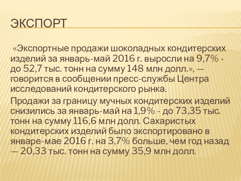 на 9,7% - до 52,7 тыс. тонн на сумму 148 млн долл.», — говорится в сообщении пресс-службы Центра исследований кондитерского рынка.