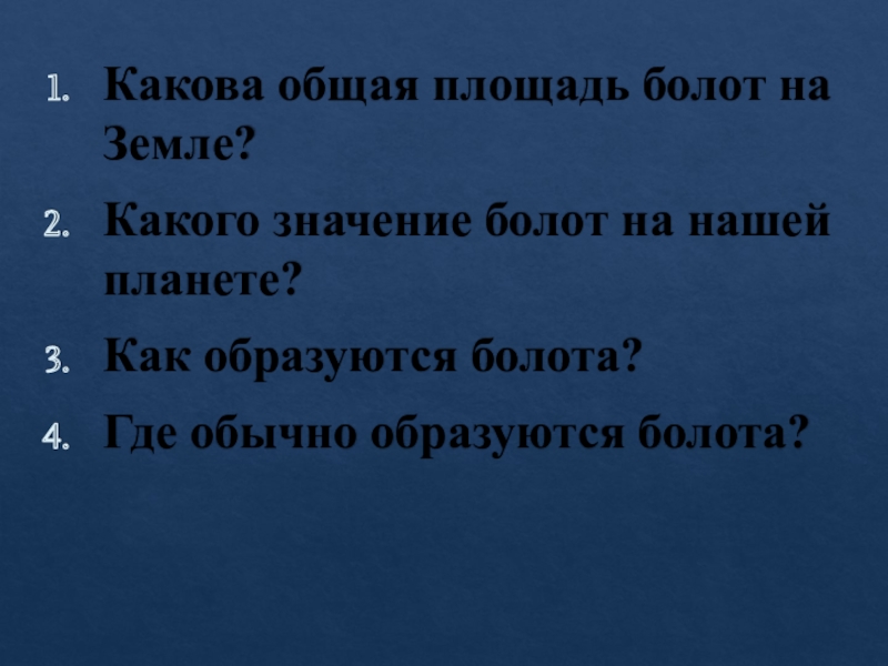 Какова общая площадь болот на Земле?Какого значение болот на нашей планете?Как образуются болота?Где обычно образуются болота?