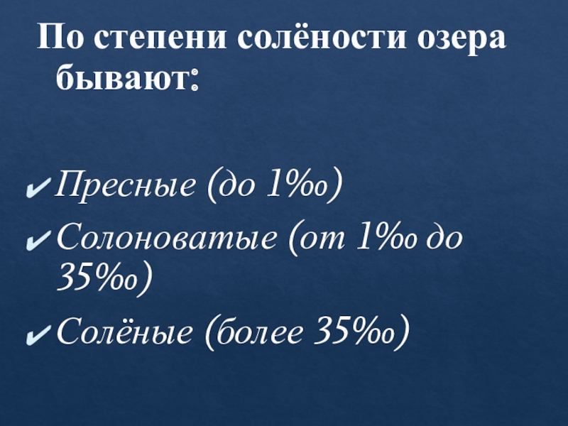 По степени солёности озера бывают:Пресные (до 1‰)Солоноватые (от 1‰ до 35‰)Солёные (более 35‰)