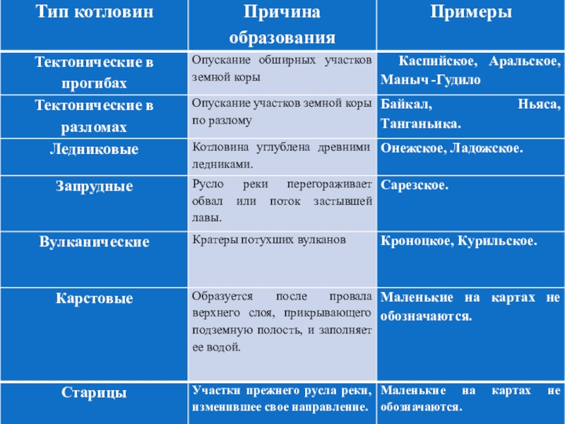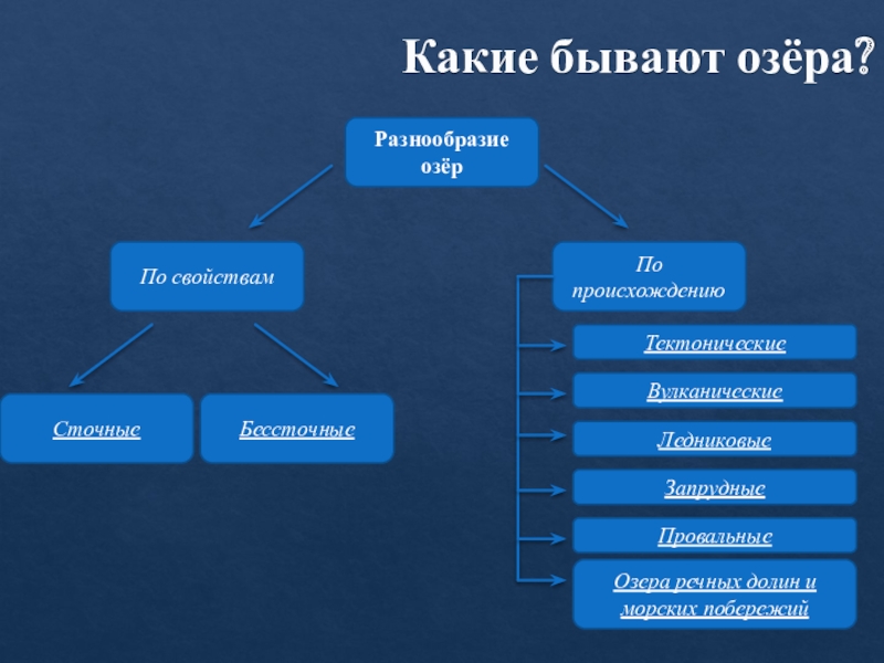 Какие бывают озёра?Разнообразие озёрПо происхождениюПо свойствамСточныеБессточныеТектоническиеВулканическиеЛедниковыеЗапрудныеПровальныеОзера речных долин и морских побережий