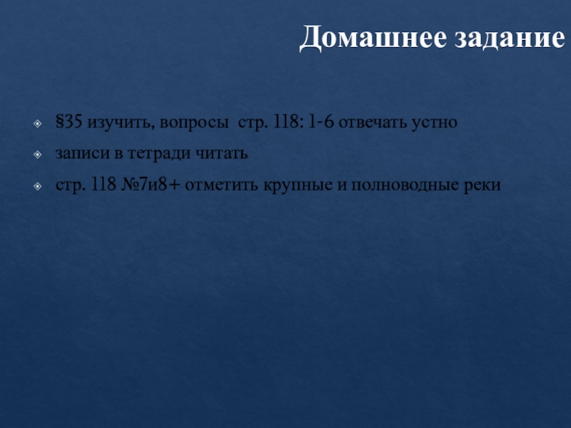 Домашнее задание§35 изучить, вопросы стр. 118: 1-6 отвечать устно записи в тетради читатьстр. 118 №7и8+ отметить крупные