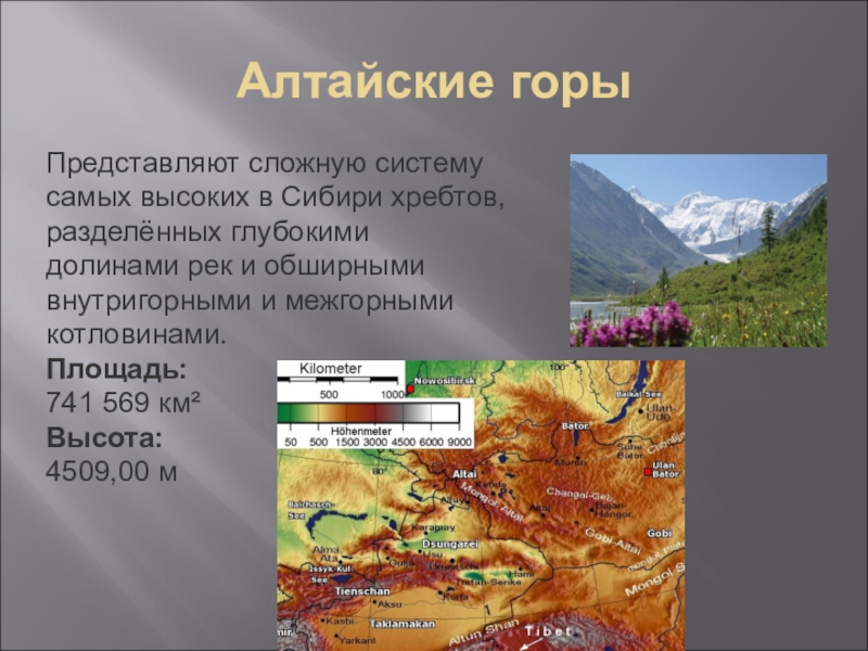 Алтайские горыПредставляют сложную систему самых высоких в Сибири хребтов, разделённых глубокими долинами рек и обширными внутригорными и