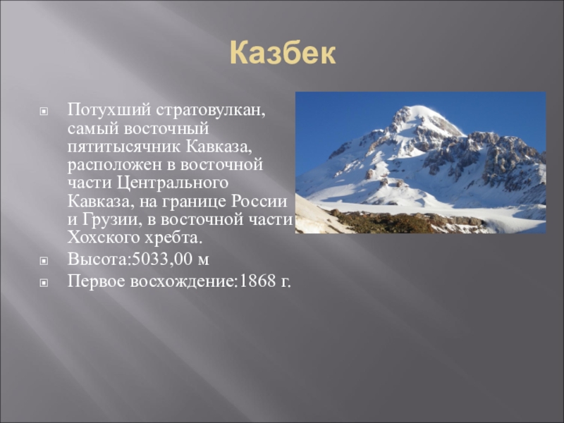 КазбекПотухший стратовулкан, самый восточный пятитысячник Кавказа, расположен в восточной части Центрального Кавказа, на границе России и Грузии,