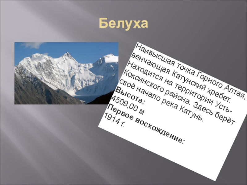 Наивысшая точка Горного Алтая, венчающая Катунский хребет. Находится на территории Усть-Коксинского