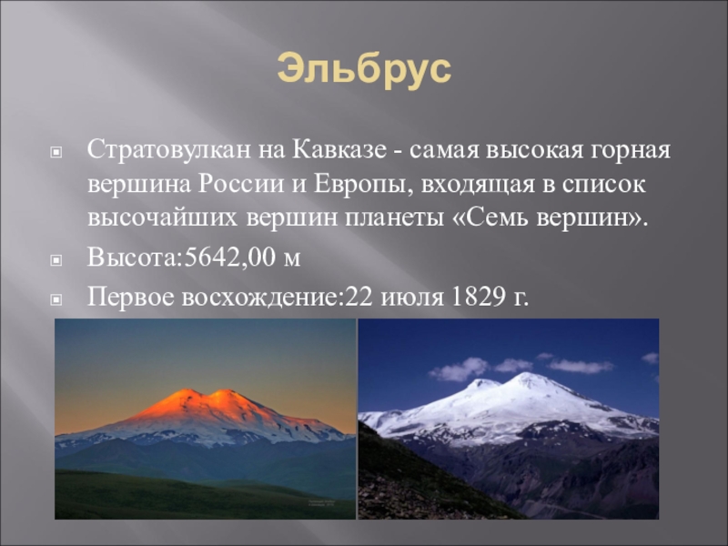ЭльбрусСтратовулкан на Кавказе - самая высокая горная вершина России и Европы, входящая в список высочайших вершин планеты