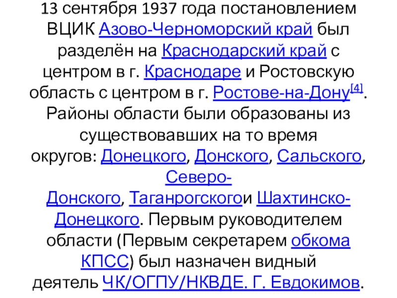 Слайд 1413 сентября 1937 года постановлением ВЦИК Азово-Черноморский край был разделён на Краснодарский край с центром