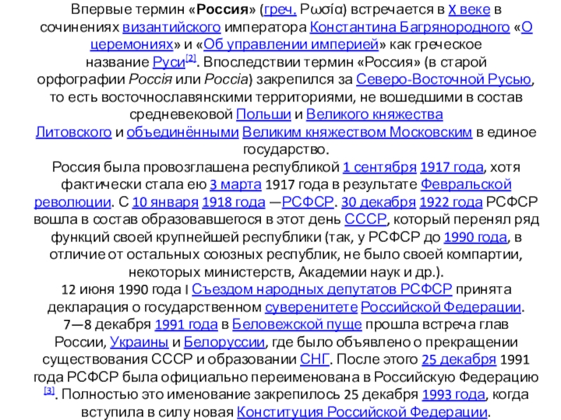 Слайд 3Впервые термин «Россия» (греч. Ρωσία) встречается в X веке в сочинениях византийского императора Константина Багрянородного «О церемониях» и