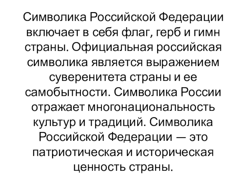 Официальная российская символика является выражением суверенитета страны и ее самобытности. Символика России отражает многонациональность культур и традиций. Символика Российской Федерации — это патриотическая и историческая ценность страны.