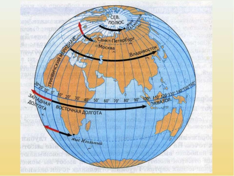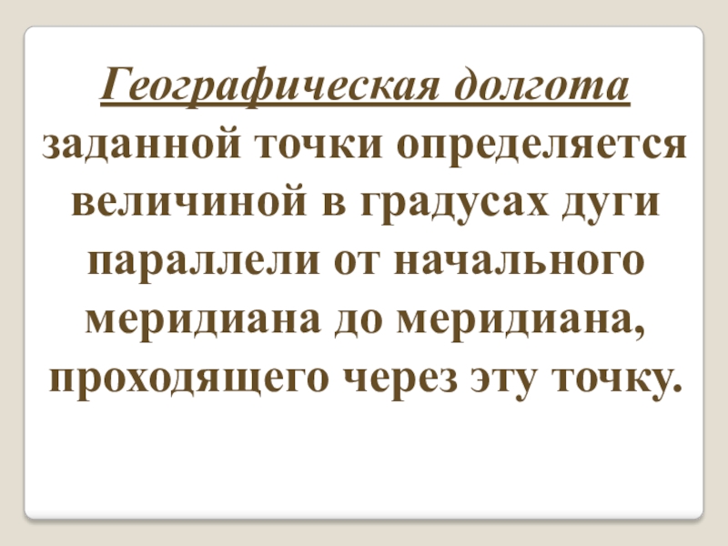 Слайд 11Географическая долгота заданной точки определяется величиной в градусах дуги параллели от