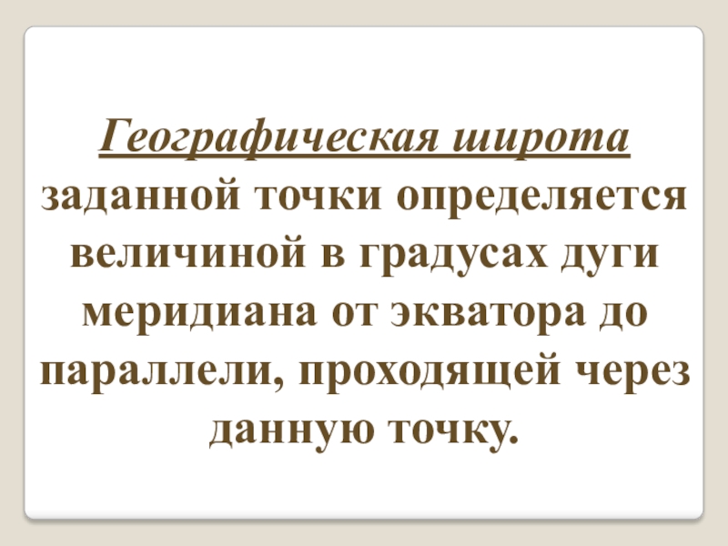 Слайд 8Географическая широта заданной точки определяется величиной в градусах дуги меридиана от