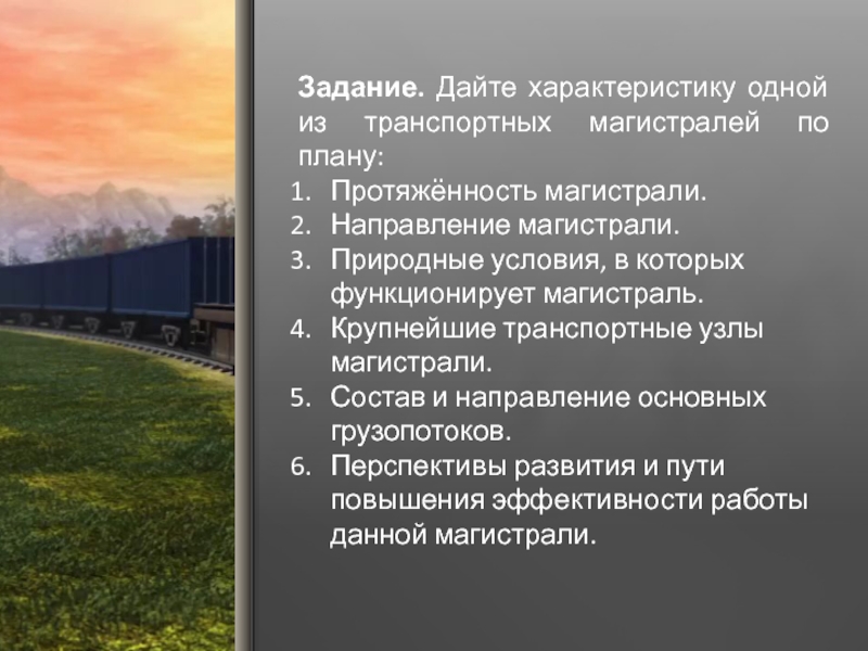 Грузы, идущие на восток: продовольствие, товары народного потребления, оборудование для добычи полезных ископаемых, контейнерные перевозки со скоропортящимися продуктами.