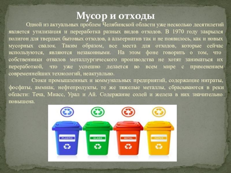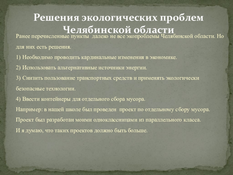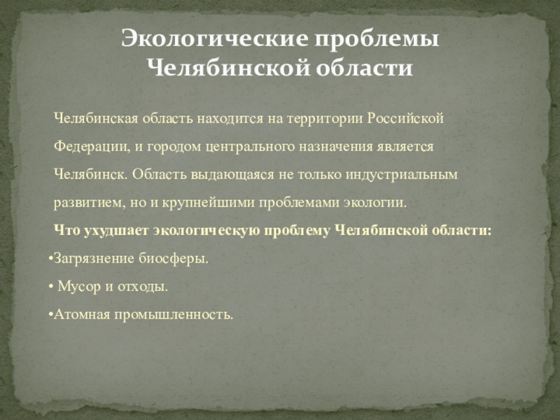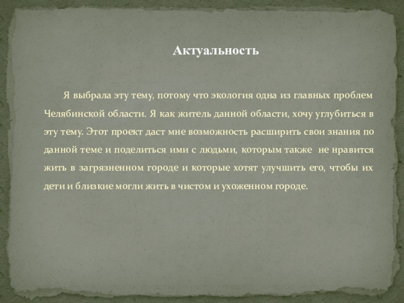 Я выбрала эту тему, потому что экология одна из главных проблем Челябинской области. Я как житель данной области, хочу углубиться в эту тему. Этот проект даст мне возможность расширить свои знания по данной теме и поделиться ими с людьми, которым также не нравится жить в загрязненном городе и которые хотят улучшить его, чтобы их дети и близкие могли жить в чистом и ухоженном городе.