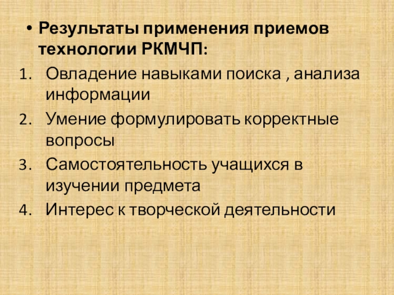 Слайд 12Результаты применения приемов технологии РКМЧП: