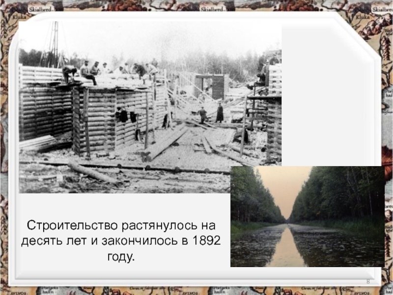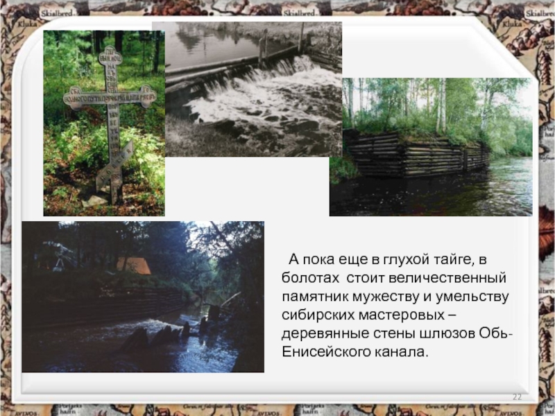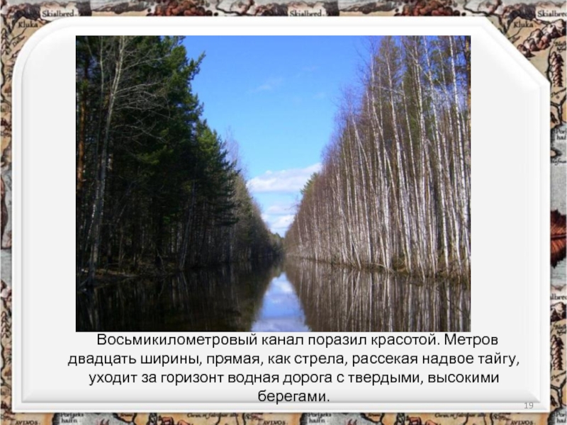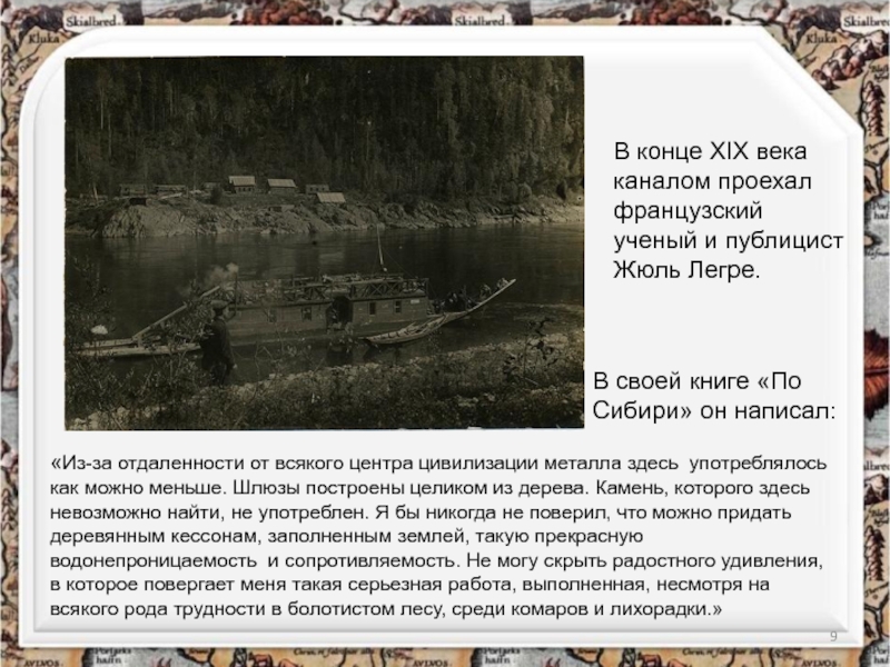 «Из-за отдаленности от всякого центра цивилизации металла здесь употреблялось как можно меньше. Шлюзы построены целиком из дерева. Камень, которого здесь невозможно найти, не употреблен. Я бы никогда не поверил, что можно придать деревянным кессонам, заполненным землей, такую прекрасную водонепроницаемость и сопротивляемость. Не могу скрыть радостного удивления, в которое повергает меня такая серьезная работа, выполненная, несмотря на всякого рода трудности в болотистом лесу, среди комаров и лихорадки.»