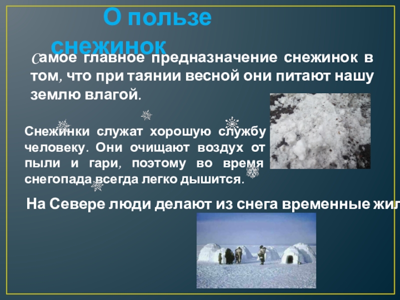 определить полезные свойства снежинок;