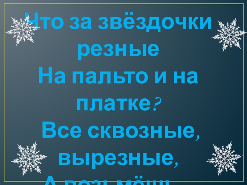 Снежинки служат хорошую службу человеку. Они очищают воздух от пыли и гари, поэтому во время снегопада всегда легко дышится.