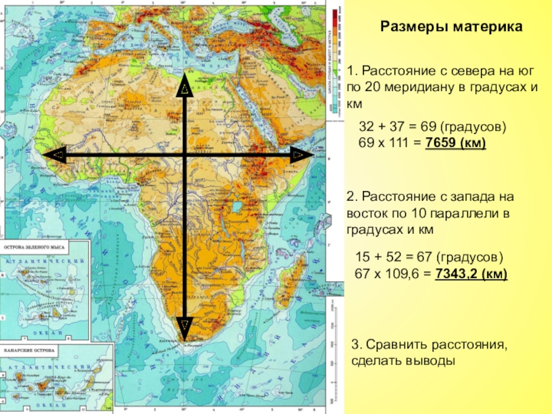 2. Расстояние с запада на восток по 10 параллели в градусах и км