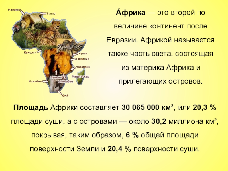Площадь Африки составляет 30 065 000 км², или 20,3 % площади суши, а с островами — около 30,2 миллиона км², покрывая, таким образом, 6 % общей площади поверхности Земли и 20,4 % поверхности суши.