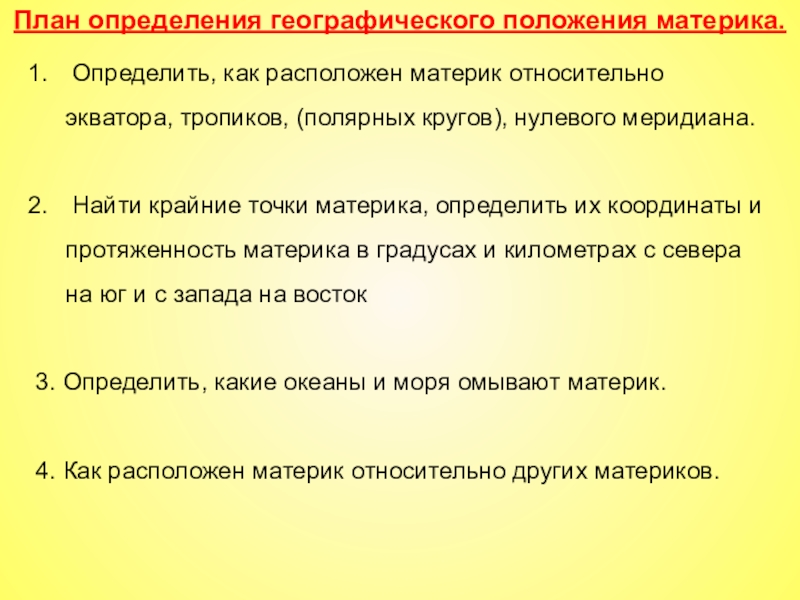 План определения географического положения материка.