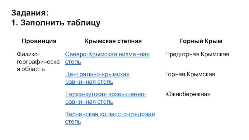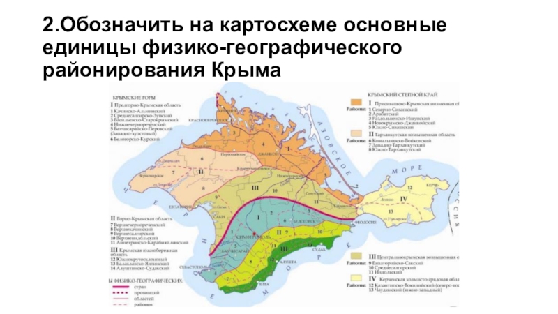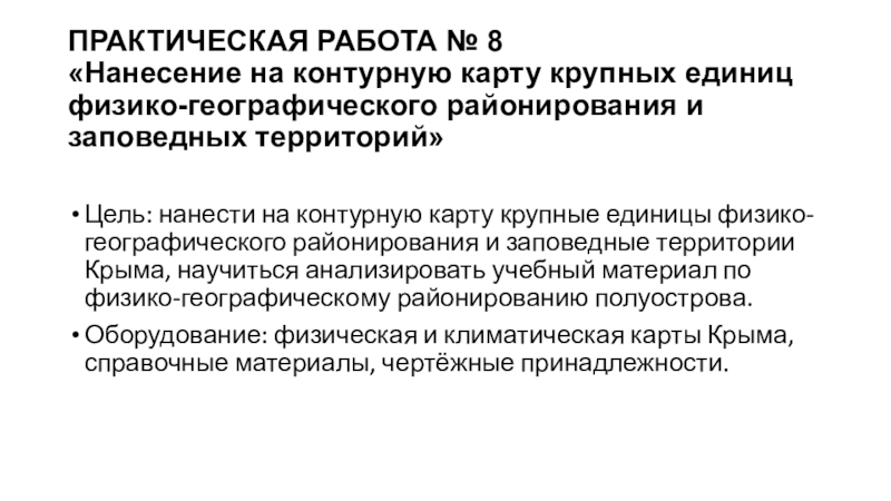 Цель: нанести на контурную карту крупные единицы физико-географического районирования и заповедные территории Крыма, научиться анализировать учебный материал по физико-географическому районированию полуострова.