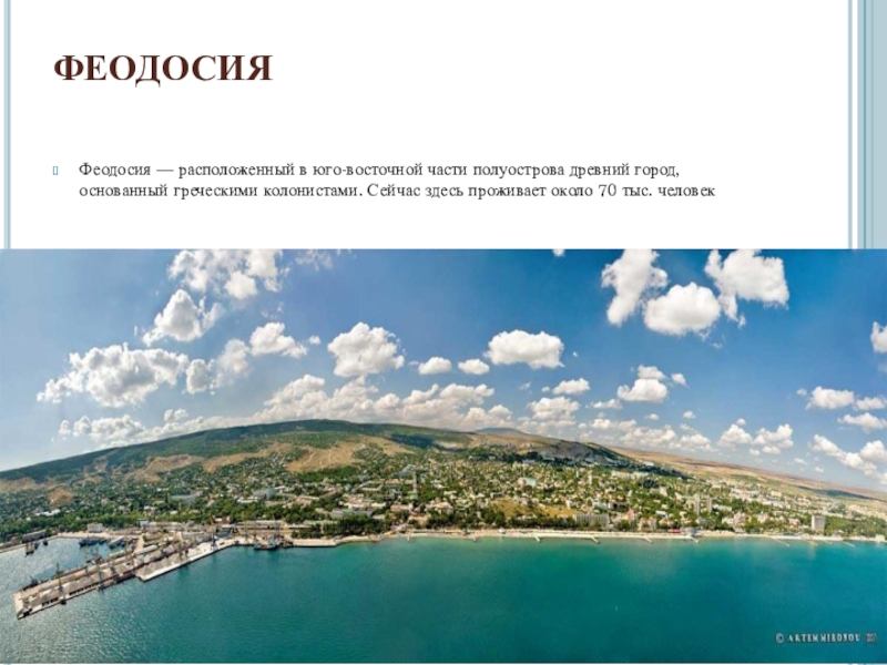 ФЕОДОСИЯ Феодосия — расположенный в юго-восточной части полуострова древний город, основанный греческими колонистами. Сейчас здесь проживает около
